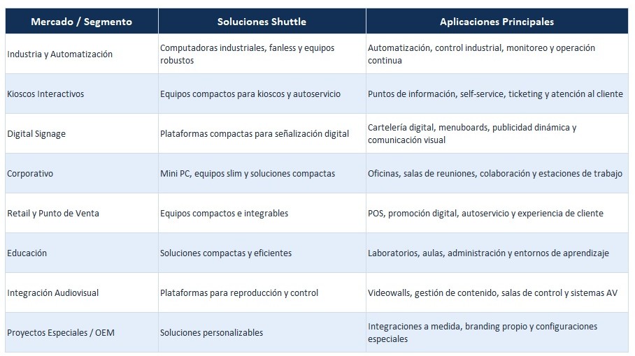 Las soluciones Shuttle se adaptan a una gran variedad de aplicaciones, desde automatización industrial y kioscos interactivos hasta señalización digital, entornos corporativos, retail, educación e integración audiovisual. Su diseño compacto, confiable y flexible permite desarrollar proyectos modernos, eficientes y preparados para las exigencias de cada mercado.